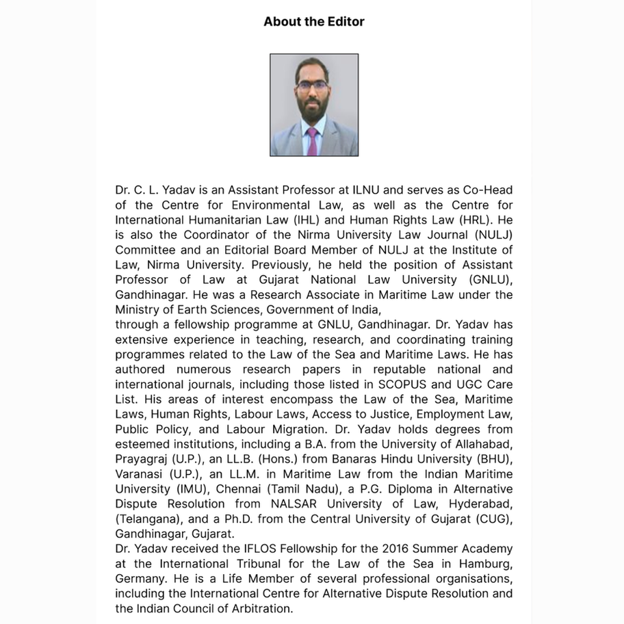 Dr. C. L. Yadav is an Assistant Professor at ILNU and serves as Co-Head of the Centre for Environmental Law, as well as the Centre for International Humanitarian Law (IHL) and Human Rights Law (HRL). He is also the Coordinator of the Nirma University Law Journal (NULJ) Committee and an Editorial Board Member of NULJ at the Institute of Law, Nirma University. Previously, he held the position of Assistant Professor of Law at Gujarat National Law University (GNLU), Gandhinagar. He was a Research Associate in Maritime Law under the Ministry of Earth Sciences, Government of India.